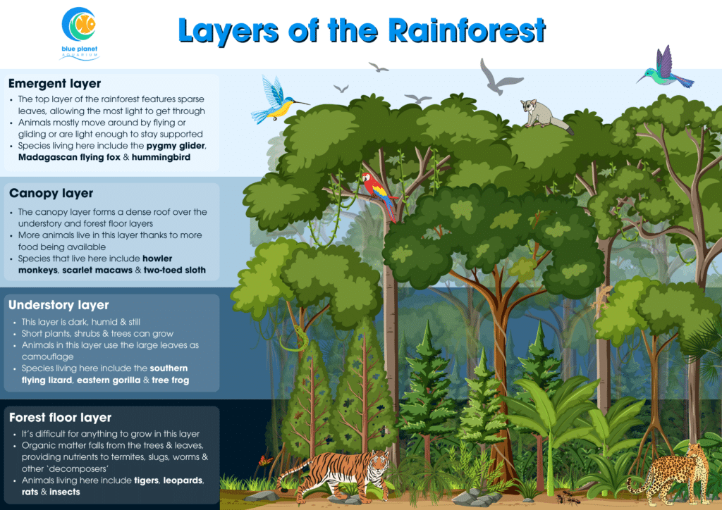 There are four main layers contained within rainforests, with the emergent layer at the top, the canopy and understory layers in the middle and the forest floor layer at the bottom. Let’s work our way down the rainforest and learn about each layer in a little more detail.