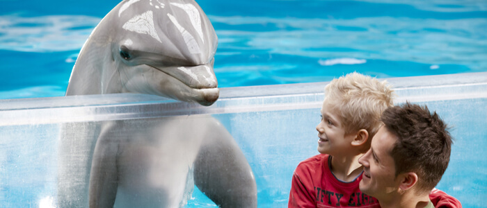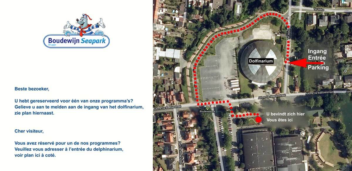Voor dit programma moet u zich aanmelden aan de achterkant van het dolfinarium, NIET aan het onthaal van het park. Bekijk hier het plannetje waar je de ingang kan vinden.