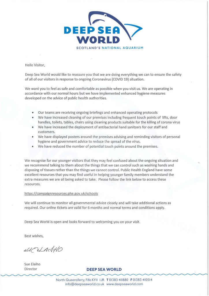A message for those of you considering a visit to Deep Sea World whilst there are concerns around the world with Coronavirus (COVID-19).