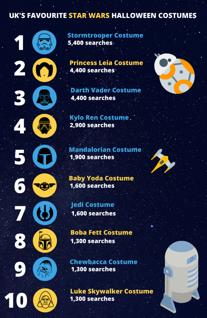 Star Wars bucks the trend compared to other Disney film franchises, with the majority of its most popular costumes being villains. The Stormtrooper costume is, without doubt, the most popular Halloween getup, while Darth Vader and Kylo Ren came above heroes like Luke Skywalker and Chewbacca.