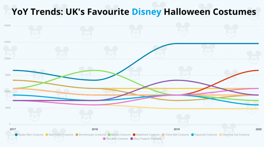 From the chart, there are some interesting changes to note, and these largely fall in line with when new Disney films were released. For example, in 2017, Stormtrooper costumes proved one of the most popular Halloween dress-up ideas, after the huge success of Last Jedi and The Force Awakens. The same can be said of interest in Elsa costumes in 2020, after the release of Frozen II thrust the character back into the limelight.