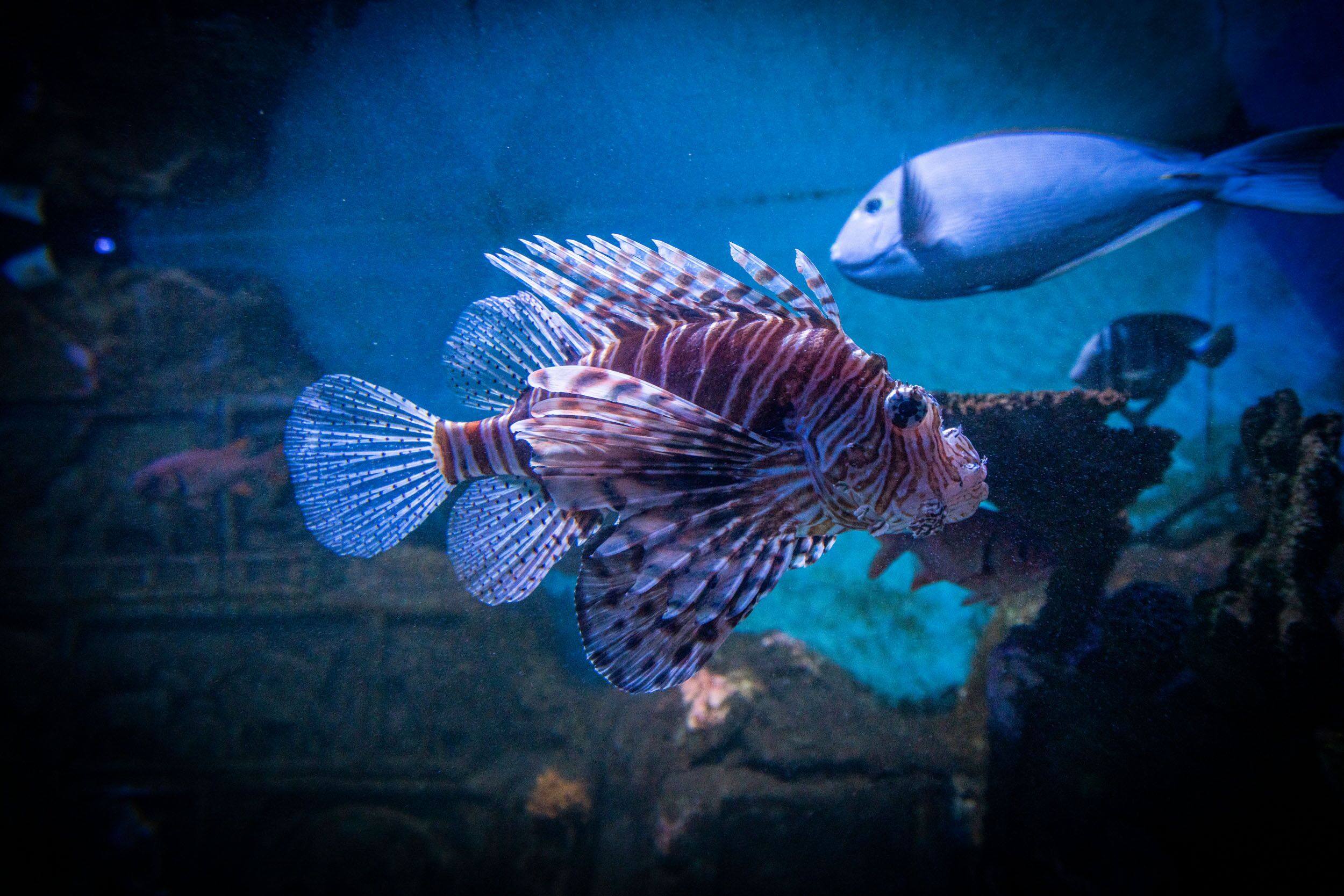 These venomous fish are native to Indo-Pacific waters, however they can now be found in the Atlantic Ocean too where they are an invasive species. Lionfish like their on land namesake are fantastic hunters and have adapted many techniques to catch their food.